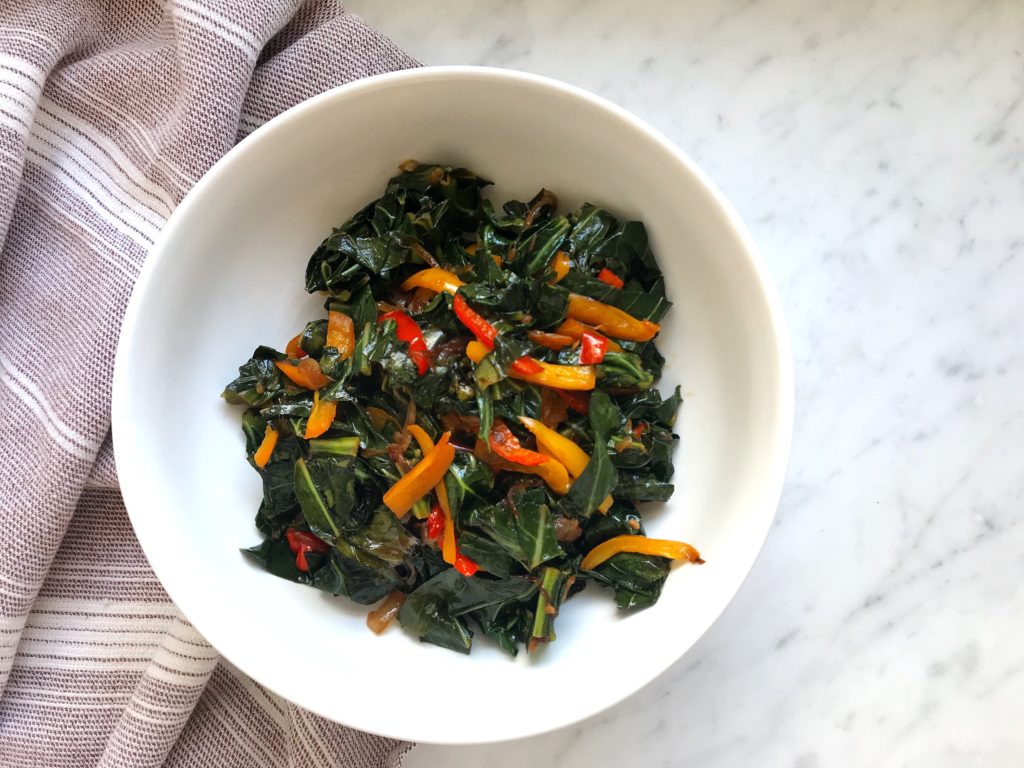 Growing up I became accustomed to the standard soggy collards- swimming in swampy water with nearly a cup full of white sugar dumped in to disguise the bitterness of the greens.  It wasn’t until recently that we changed up our collard green recipe to this lighter healthier option that I keep going back to.  We will never go back to the old soggy stewed collards.